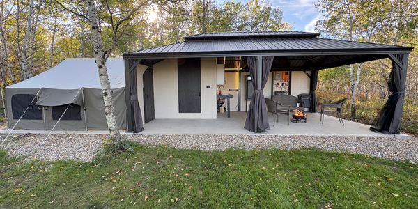 Each rental site contains a heavy duty Kodiak 12' x 12' canvas tent featuring a queen bed (foam mattress) and two double foam mattresses for sleeping accommodations. Attached to the canvas tent is a 14’ x 22’ gazebo with a solid roof and screen and/or privacy curtains. The accommodation is completed with a private full bathroom including toilet, shower, and sink (hot and cold water). The gazebo also houses a kitchen space with double sinks, patio furniture, a propane fire pit, and BBQ. Each site is powered using bi-facial 1130w solar panels, using a 3000w inverter to convert to 120v. Lighting is provided at 24v.